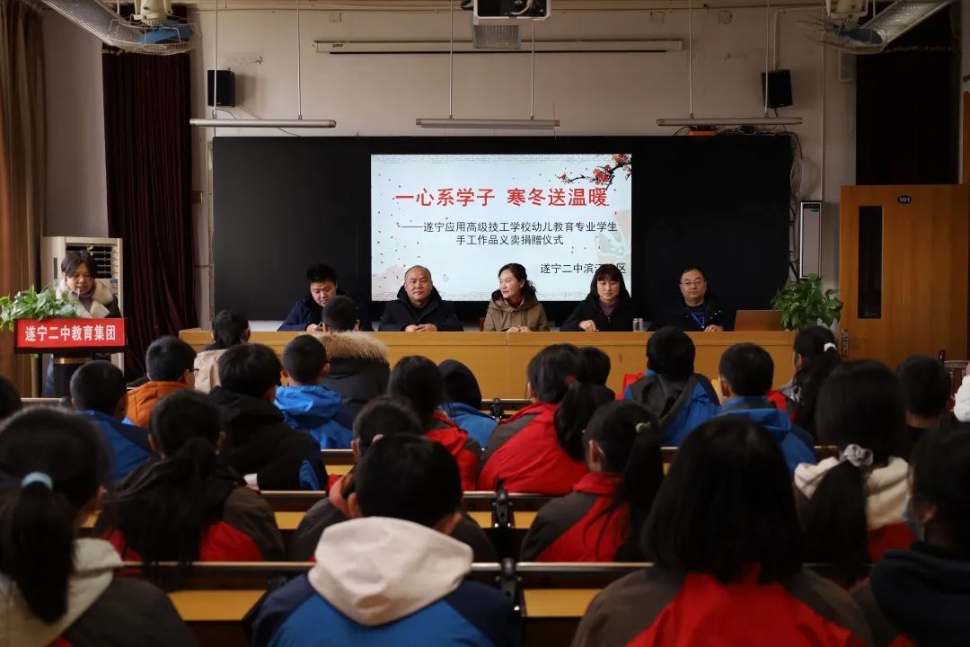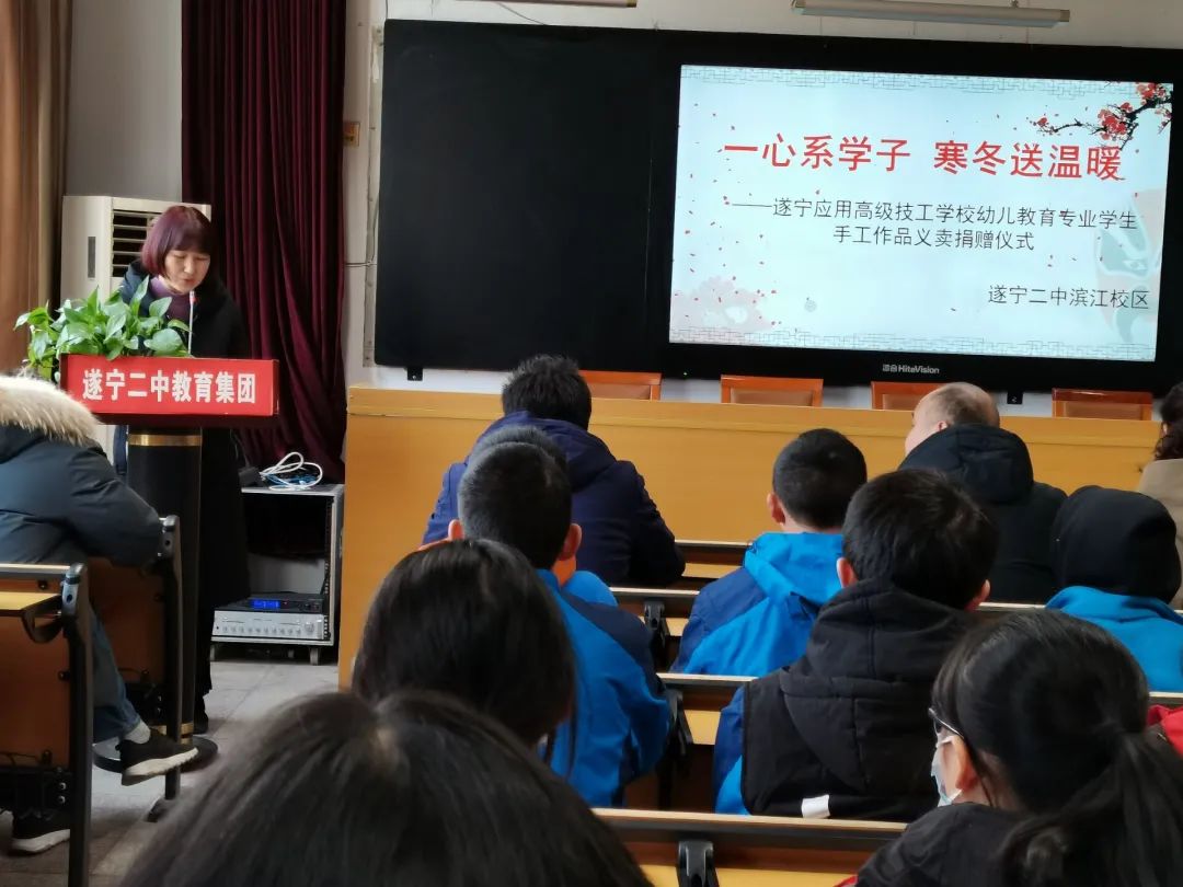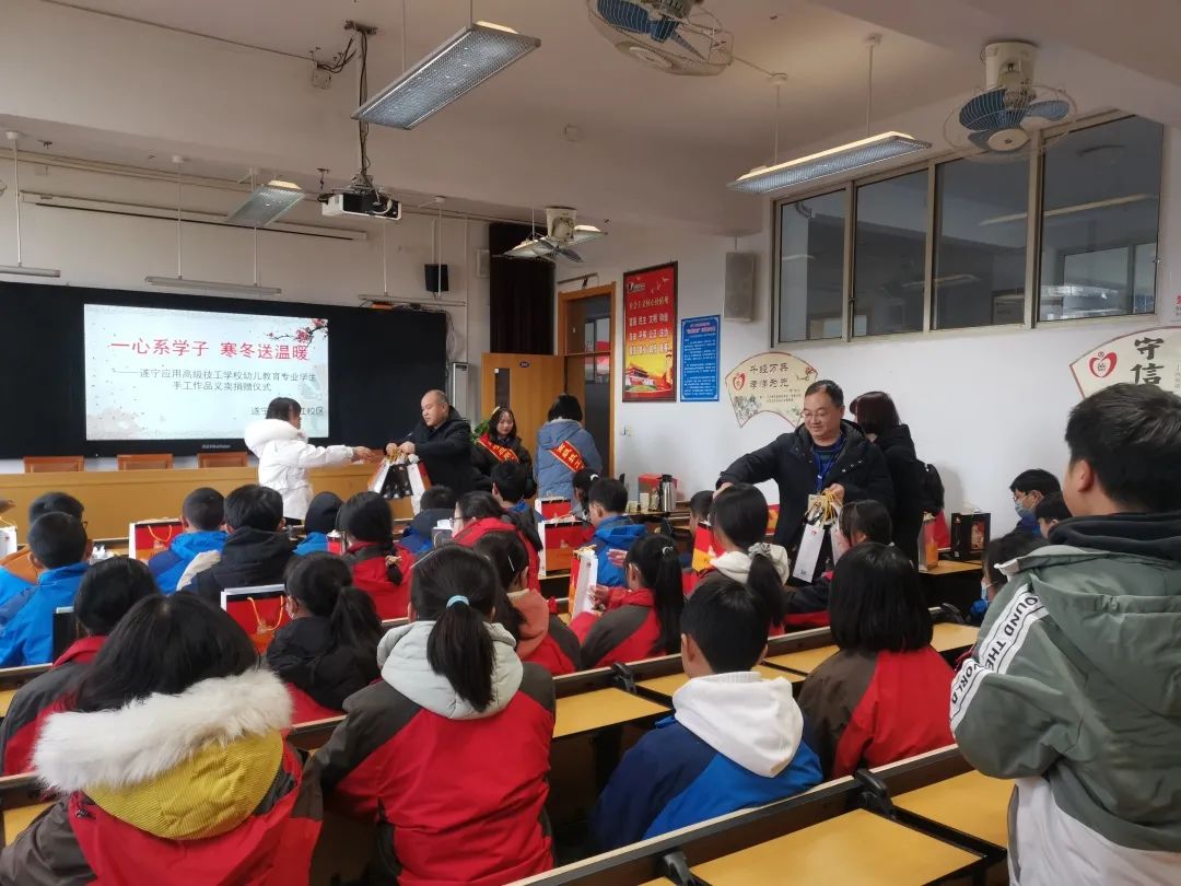 据介绍,遂宁应用高级技工学校幼儿教育专业的学生充分发挥自身特长,以创新思维,通过自己的双手亲手制作的手工作品,通过义卖,共获得了1723.6元的酬劳,并全部捐献给了遂宁二中滨江校区的学子。捐赠仪式上,除了义卖所得,遂宁应用高级技工学校还为遂宁二中滨江校区近30名建档立卡学子们送上了精美的小礼物,带去了冬日的温暖与祝福。