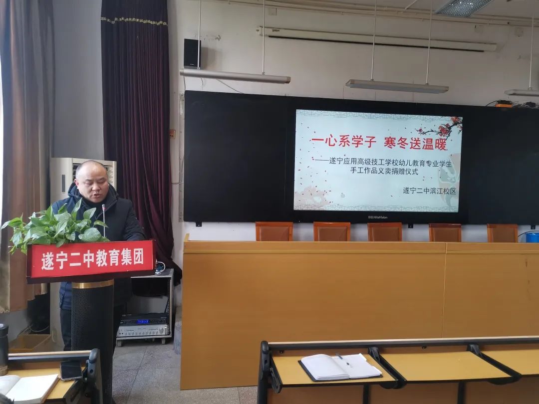 1月11日,在遂宁二中滨江校区内,一件件精美的慰问品摆放在学校会议室,遂宁应用高级技工学校幼儿教育专业师生手工作品义卖捐赠仪式在此举行。