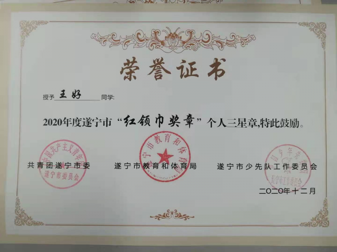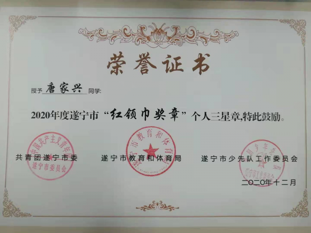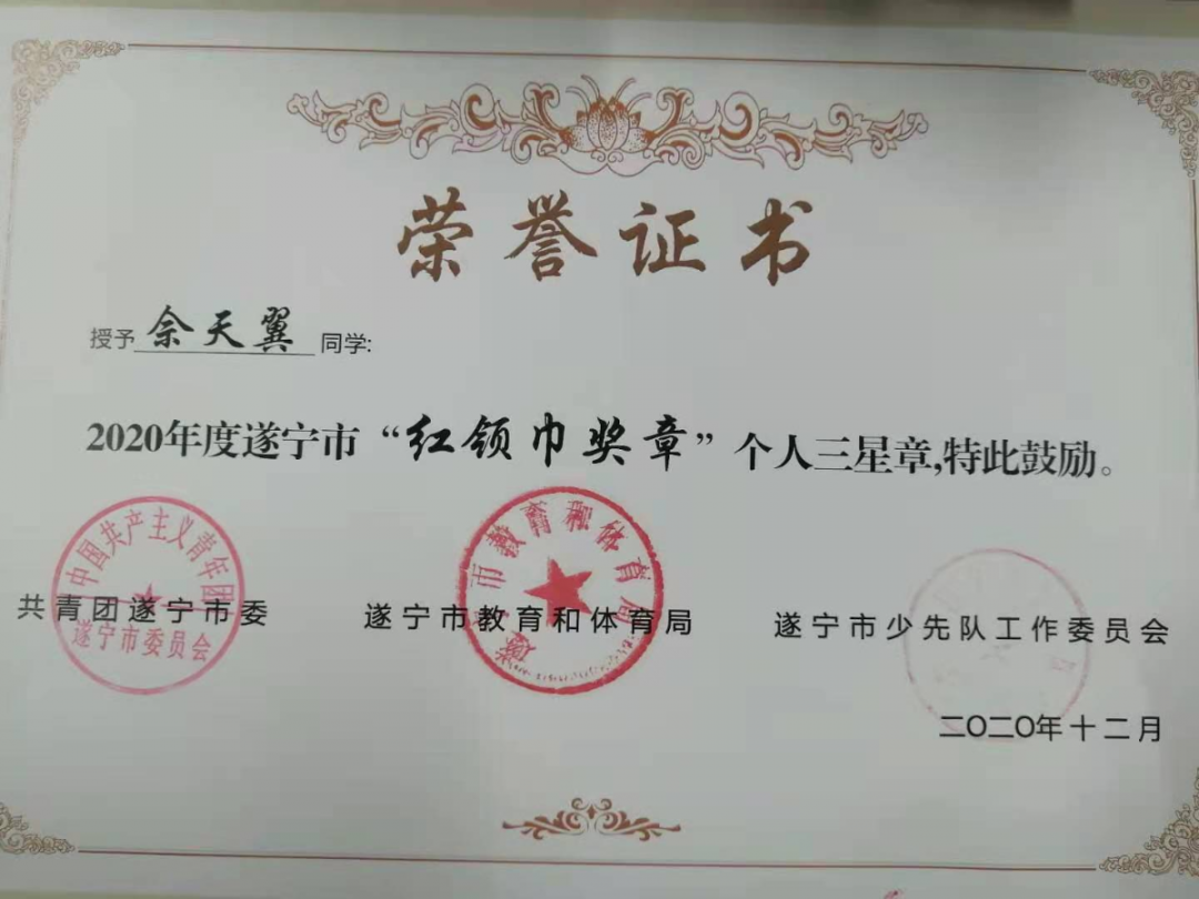 为深入学习贯彻习近平总书记对少年儿童和少先队工作重要指示和第八次全国少代会精神,认真落实三大少先队制度性文件,不断创新教育引导的方式方法,引导广大少先队员争做“新时代好队员”,激励广大少先队辅导员更加热爱少先队工作,全市少先队改革任务全面落实,少先队组织不断迸发出新的生机和活力,涌现出一大批优秀集体和个人。经逐级推荐、认真审核、网络公示后,我校以下优秀少先队员荣获遂宁市“红领巾奖章”三星章: