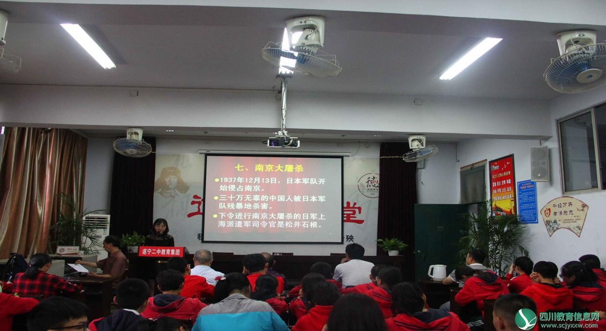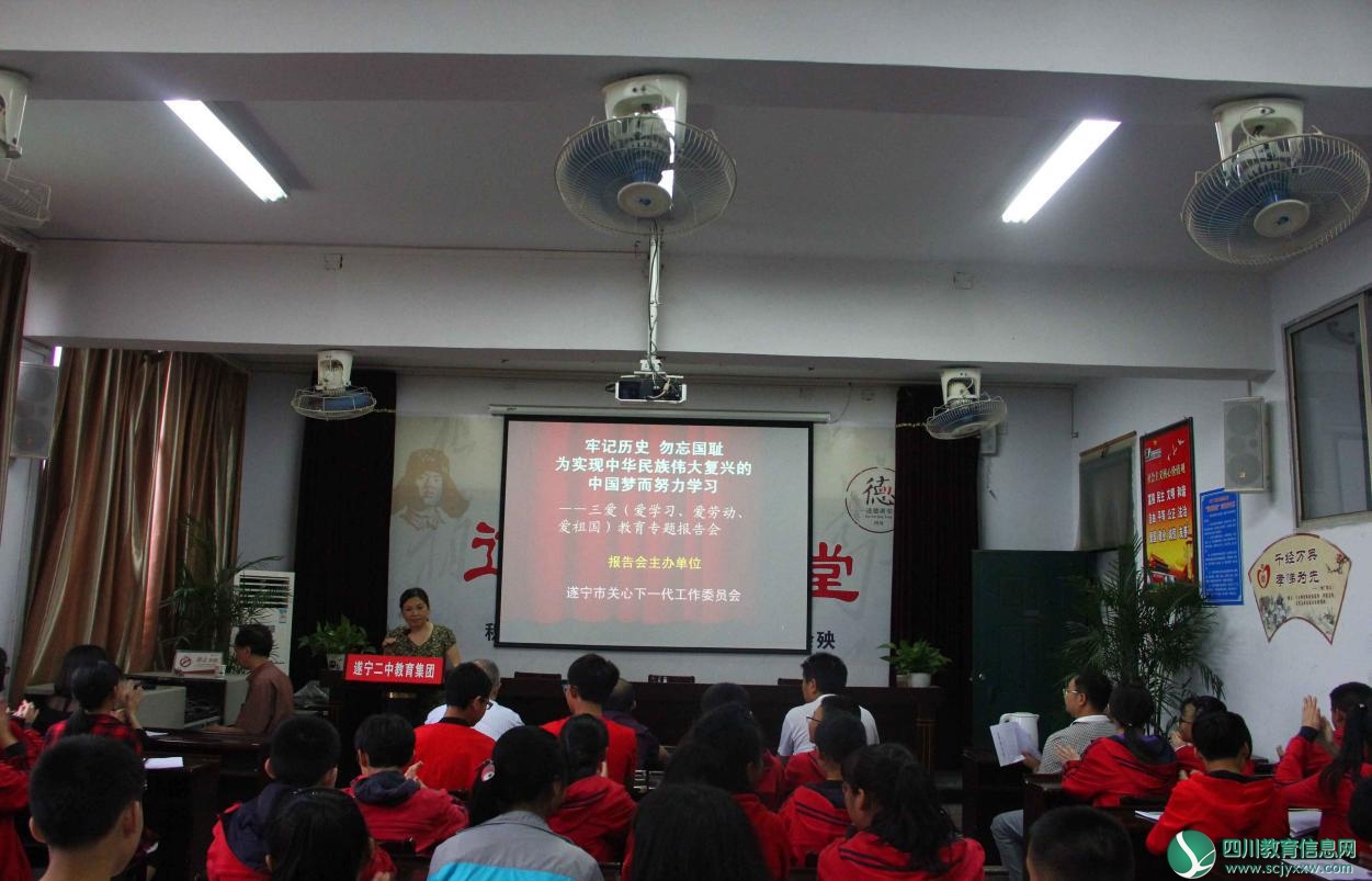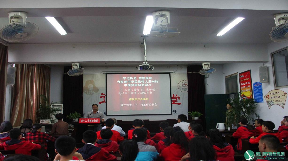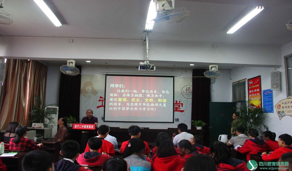 为了缅怀先烈的丰功伟绩,弘扬中华民族伟大的抗争精神,让学生了解中国近代鸦片战争以来那段血泪斑斑的历史,5月17日,市关工委、市教育局和遂宁二中滨江校区在学校五楼多功能会议室联合召开以“牢记历史,勿忘国耻,为实现中华民族伟大复兴的中国梦而努力学习”为主题的革命传统教育报告会。