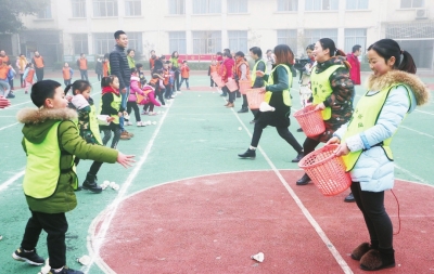 12月22日,遂宁二中教育集团滨江校区小学部首届亲子运动会上,父母和孩子相互配合完成各项比赛。