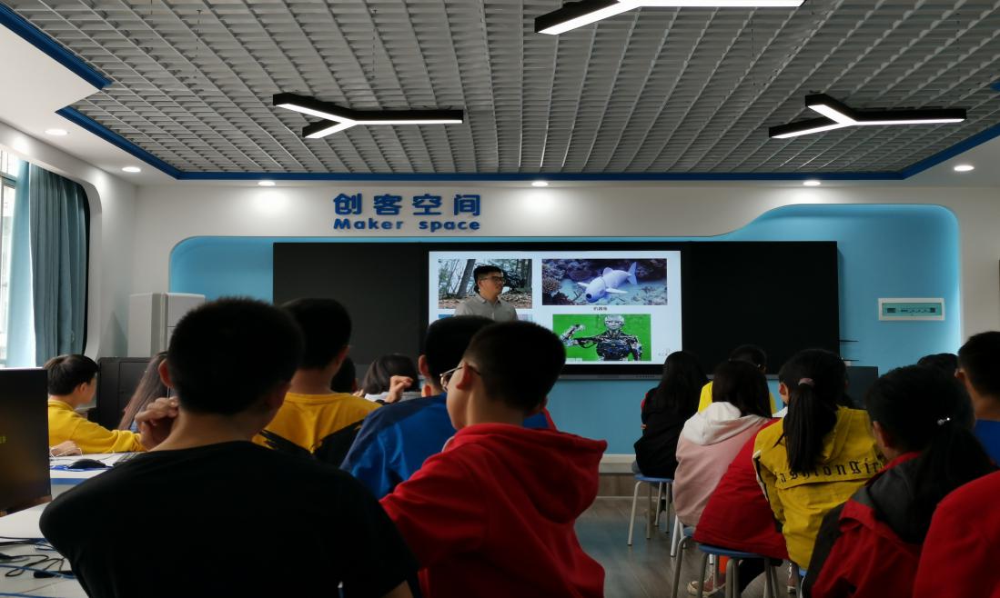 郝老师给孩子们介绍机器狗、机器鱼和机器鸟的广泛应用