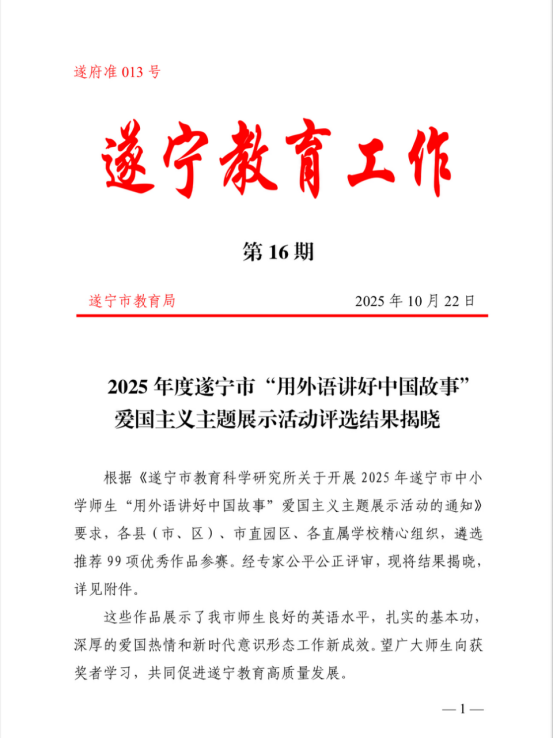 热烈祝贺我校杨李梓文和杨舜淇两位同学在2025年度遂宁市“用外语讲好中国故事”爱国主义主题展示活动评选中喜获二等奖!