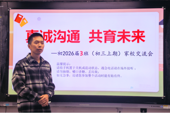 会议伊始,初三年级主管向昆代表年级致欢迎辞,他对家长们的到来表示热烈欢迎,并强调:“初三是孩子学业生涯的关键转折点,本次家长会的核心目标,就是进一步加强家校沟通,促进家长与教师的合作,共同关注孩子的成长与发展,通过家校紧密协作,为孩子们的中考保驾护航。”