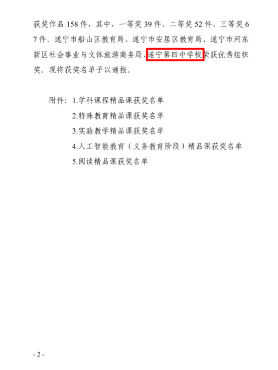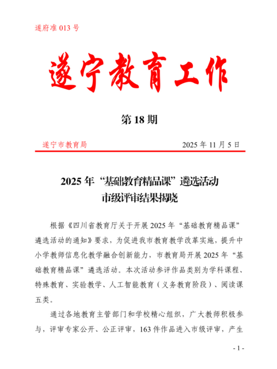 热烈祝贺我校在遂宁市2025年“基础教育精品课”遴选活动中荣获优秀组织奖!在此次活动中,我校多名教师表现出色,斩获五个一等奖、三个二等奖以及两个三等奖!