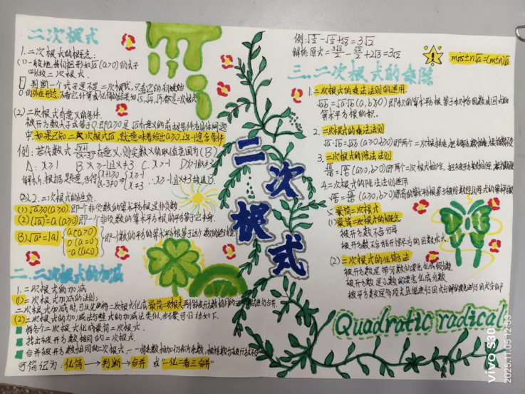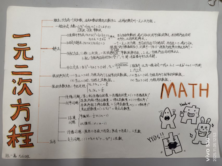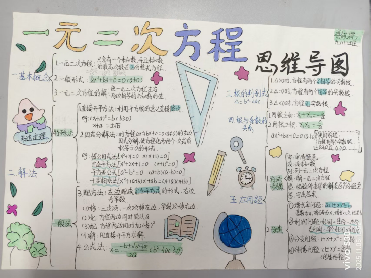 以“一元二次方程”为核心的思维导图创作大赛,引导学生跳出单一知识点的局限,从概念内涵、公式推导、题型分类到实际应用,多角度梳理知识脉络。同学们积极构思、巧思设计,将抽象的数学逻辑转化为色彩鲜明、条理清晰的图形语言。一幅幅优秀作品不仅展现了完整的知识框架,更折射出对知识点的深度理解与灵活串联,让数学思维在笔尖绽放。