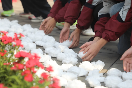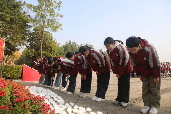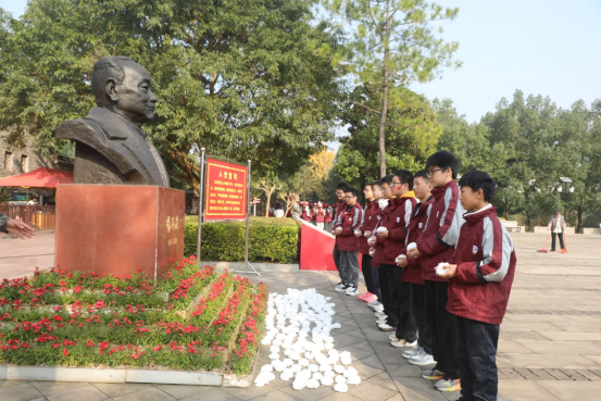 在带队老师的带领下,学生代表缓步上前,小心翼翼地将鲜花敬献于铜像基座,深深鞠躬,以此表达对革命先辈的深切缅怀与崇高敬意。同学们高举右拳,庄严宣誓:“传承红色基因,勇担时代使命,勤奋学习,报效祖国!”铿锵有力的誓言穿透云霄,既是对革命先辈的深情告慰,更是新时代少年接力奋斗的坚定承诺。献花仪式虽短,却让红色精神深深烙印在同学们心中,成为激励大家砥砺前行的精神力量。