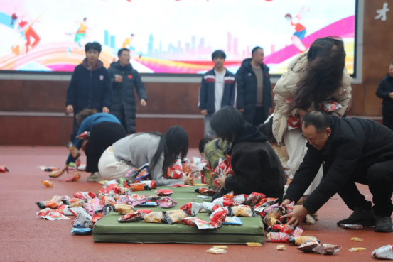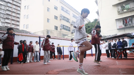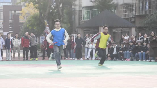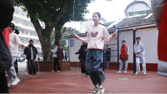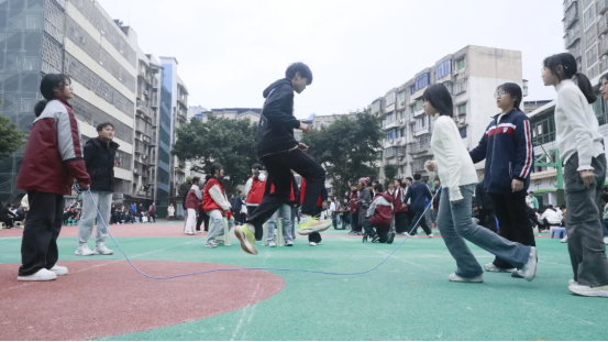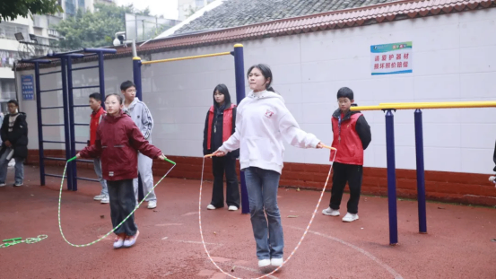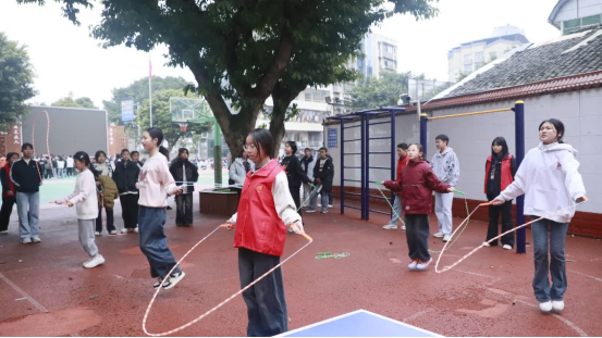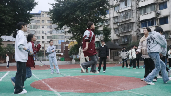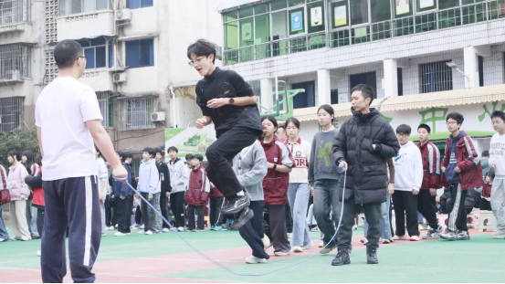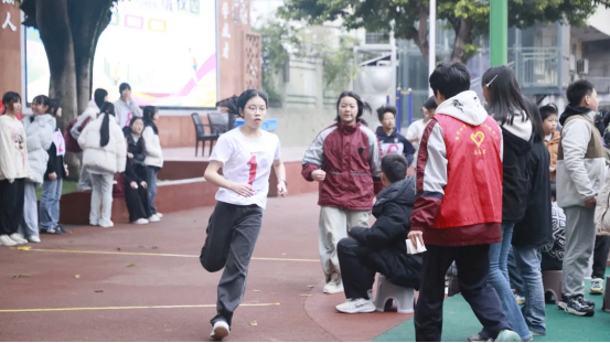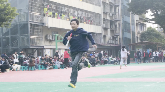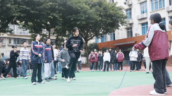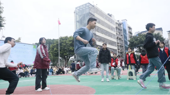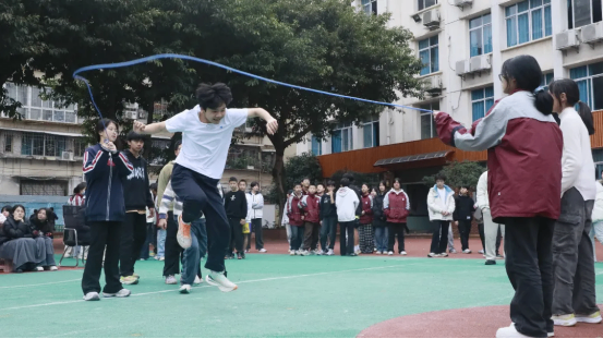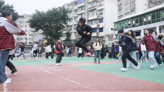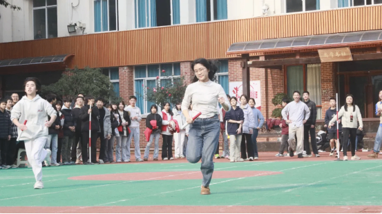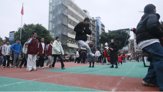 最富趣味性的三分钟8字跳绳项目,每班跳绳队员与摇绳队员配合无间,师生同乐,长绳飞舞,人影穿梭,构成了一幅和谐而充满活力的动人画卷。