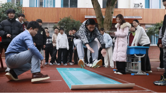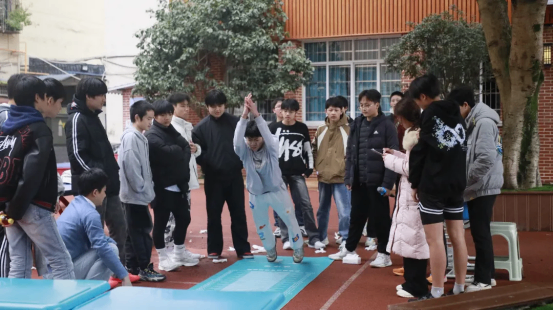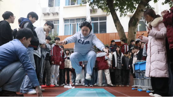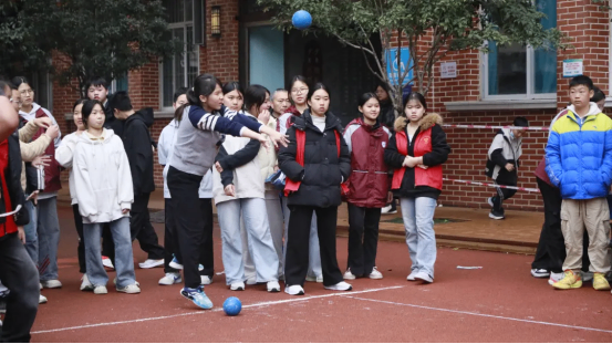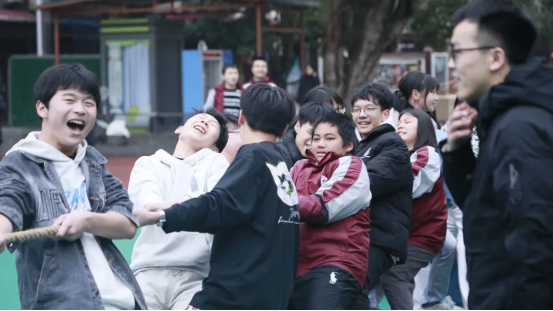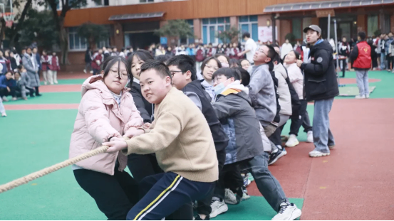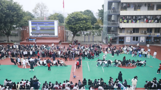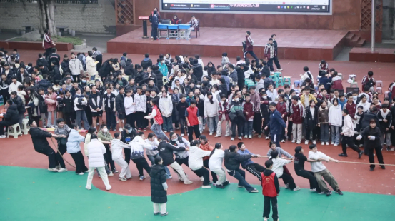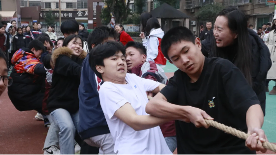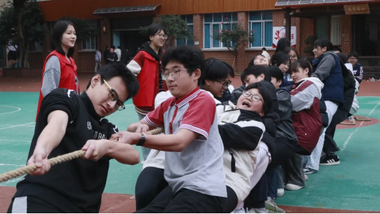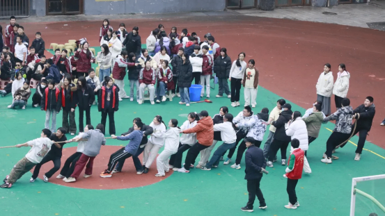 拔河比赛中,各班运动员紧握长绳,团结一心,寸土必争,场边的加油声此起彼伏,展现了无与伦比的班级凝聚力。