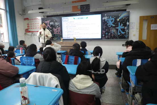 集中会议阶段,分管教学工作的副校长李攀华率先与家长们交流分享。他对家长们的到来表示热烈欢迎与衷心感谢,围绕四大核心内容高效传递关键信息:解读新中考改革要点、总分构成及关键考试节点,明晰升学方向;详实汇报学校近一年亮眼办学成果,展现集团化办学硬实力与师生奋进风采;点明初二阶段家长需配合的重点,抓实安全管理、关注身心健康、重视体育成绩;密切家校沟通,呼吁家校携手筑牢育人防线。
